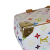 This is the authentic Louis Vuitton Multicolor Speedy 30 in White. It's made of special Multicolour Louis Vuitton monogram canvas with 33 vibrant colors on white canvas. The bag has useful features like a side pocket, sturdy rolled leather handles, and polished brass hardware. Inside, you'll find a pretty raspberry red microfiber lining with a pocket. Perfect for everyday use.