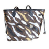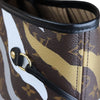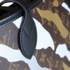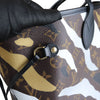 This is an authentic Louis Vuitton Neverfull MM X Lol Monogram in Gold and Silver. This LV collection piece is made of classic Louis Vuitton monogram on toile canvas with camouflage print inspired by Leauge of Legend’s champions. The tote bag comes with black leather handles, trim, side cords, and gold-tone hardware. The wide top is open to a brown striped fabric interior with a hanging zippered pocket.