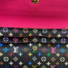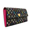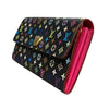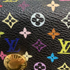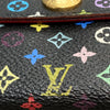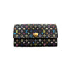 This is an authentic Louis Vuitton Sarah Wallet NM Monogram in Black and Multicolor. This stylish wallet is made from Louis Vuitton's multicolor mini monogram in 33 vibrant colors on black canvas. It has a front flap that snaps open with a gold clasp, revealing a bright pink leather interior. Inside, you'll find card slots and a central zipper compartment for easy organization.