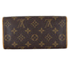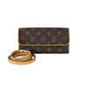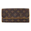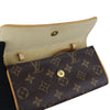 This is an authentic Louis Vuitton Twin Pochette PM Monogram in Brown. This classic pochette features Louis Vuitton's signature brown monogram on toile canvas. The handbag includes a detachable vachetta leather strap and a long flap that reveals a beige microfiber interior.