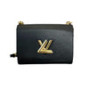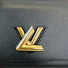 This is an authentic Louis Vuitton Twist MM Shoulder Bag Epi in Black. The trendy black shoulder bag is crafted from textured epi leather. It features a gold-tone chain strap with a comfortable leather pad and a shiny LV twist lock. This opens to a black microfiber interior with patch pockets.
