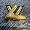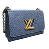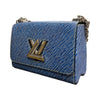 This is an authentic Louis Vuitton Twist MM Shoulder Epi in Denim Light. This stylish shoulder bag is crafted of textured blue epi leather with yellow stitching. The bag features a silver chain shoulder strap with a leather shoulder pad and a shiny silver LV twist lock on the facing flap. This opens to a natural microfiber interior with patch pockets and a mirror.