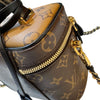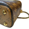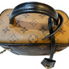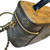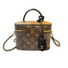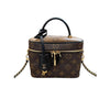 This is an authentic Louis Vuitton Vanity PM Reverse Monogram in Brown. This stylish handbag is made from monogrammed coated canvas. It has a black leather top handle, a braided gold chain shoulder strap, and gold hardware. The top zipper reveals a black microfiber interior with a patch pocket.