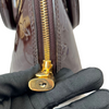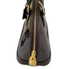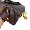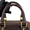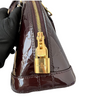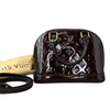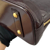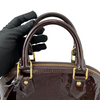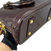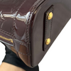 This is an authentic Louis Vuitton Vernis Alma BB in Amarante. This tote is crafted of Louis Vuitton monogram embossed vernis patent leather. This bag features rolled top handles, an optional shoulder strap, a hanging clochette with keys for the padlock and polished gold hardware. The wrap around zipper opens to a matching fabric interior with a patch pocket.