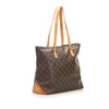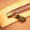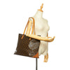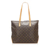 The Louis Vuitton Cabas Mezzo features a monogram canvas body, flat leather straps, a top zip closure, and interior zip and slip pockets.
