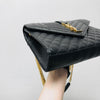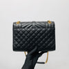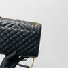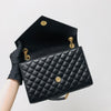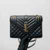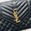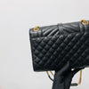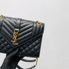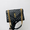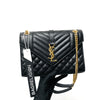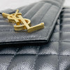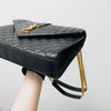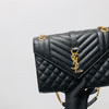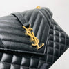 This Saint Laurent Medium Envelope bag is a stunning addition to your wardrobe. This beauty features a front flap adorned with the signature interlaced YSL initials in Gold-Toned Hardware, a gold chain and leather strap, and beautiful calfskin leather in both chevron and diamond-quilted stitching. The interior features a one slot pocket perfect for all of your essentials.