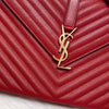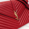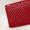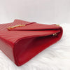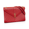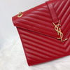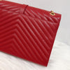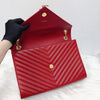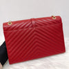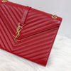 With this Saint Laurent Large Envelope bag by your side, you're ready to stand out from the rest. This gorgeous beauty features a front flap adorned with the signature interlaced YSL initials in Gold Toned Hardware, a gold chain and leather strap, and beautiful calfskin leather with chevron quilted stitching. The interior features a one slot pocket perfect for all of your essentials.