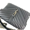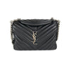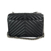 This Saint Laurent Medium College bag is a fierce fashion statement for the fashion-forward. This stunning bag features quilted leather with the signature interlaced YSL logo in aged silver hardware on the front flap. It also features a top handle as well as a removable chain and leather strap that allows for either shoulder or crossbody wear. The interior features two compartments separated by a zippered pouch as well as a one card slot, plenty of room for all of your essentials. Add a bold edge to your most basic outfit.