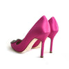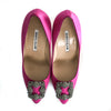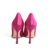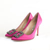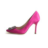 Who says Manolo's should only be reserved for weddings? Sultry yet conservative, these classic Manolo Blahnik Hangisi Heels in Fuschia add a strong feminine allure to any outfit. The perfect dichotomy between its soft satin and strong crystal embellishment makes for a great accessory for both day-to-day office attire and a special soirée. With a padded insole, these shoes are definitely a more forgiving choice for your feet!