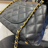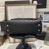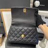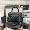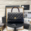This Chanel Quilted Coco Handle Caviar is a unique and elegant piece! It features a black caviar leather exterior, gold hardware, a rear patch pocket, leather top handle, a threaded gold chain link leather shoulder strap with a shoulder pad, and the signature Chanel CC turn lock closure.