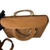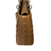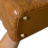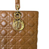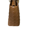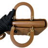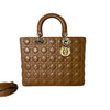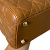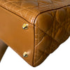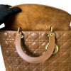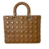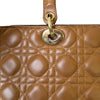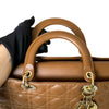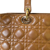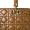 This is an authentic Christian Dior Lady Dior Lambskin Cannage in Brown. This stylish tote is made of quilted lambskin leather with a smooth geometric design. It features rolled leather handles, an optional shoulder strap, and gold-tone hardware with Dior letter charms. The top zipper opens to a spacious interior with a zippered pocket.