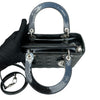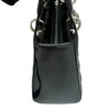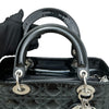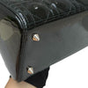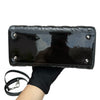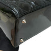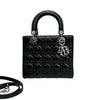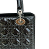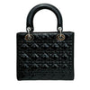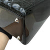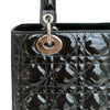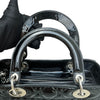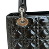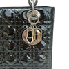 This is an authentic Christian Dior Lady Dior Medium Patent in Black. This chic tote is crafted of geometric quilted patent leather in black. The handbag features sturdy patent leather top handles, an optional shoulder strap with silver hardware, and hanging Dior logo charms. The top zipper opens to a black Dior monogram jacquard fabric interior with a zipper pocket.