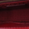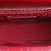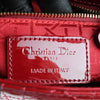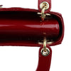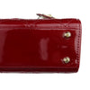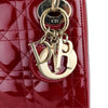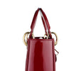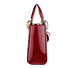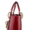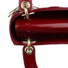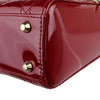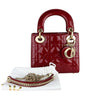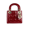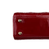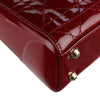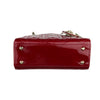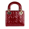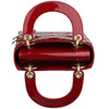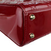 This is an authentic Christian Dior Lady Dior Mini Patent Quilted in Red. This handbag is made of red patent leather with a geometric quilted design. It has matching leather top handles, a removable shoulder strap, and gold hardware. The flap opens to reveal a red Dior monogram fabric interior with a zipper pocket.