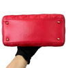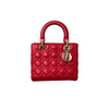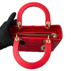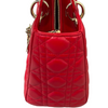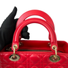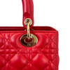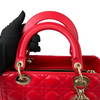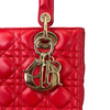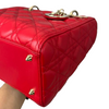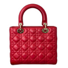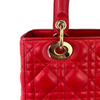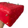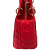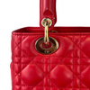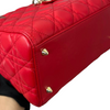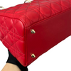 This is an authentic Christian Dior Lambskin Cannage Medium Lady Dior in Red with Gold Hardware. This stylish handbag is crafted of lambskin leather in red. It features leather top handles, an optional shoulder strap with Gold hardware. The top zipper that opens to a grey fabric interior with a zipper pocket.