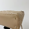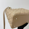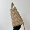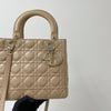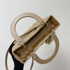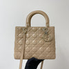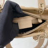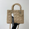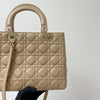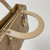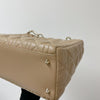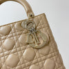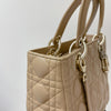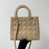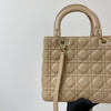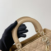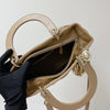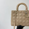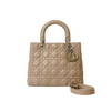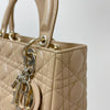 A sleek, feminine style from the iconic brand, the Dior Lady Dior Lambskin Medium features the hallmark soft geometric quilted leather topstitched with the iconic Cannage in black. The gold signature D.I.O.R. metal jewelry charms embellish it with feminine elegance, while the sturdy top handles with a long detachable chain make it versatile.