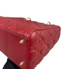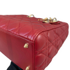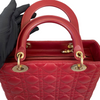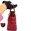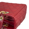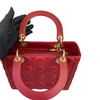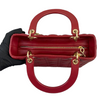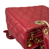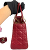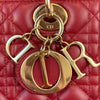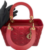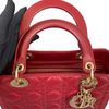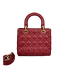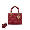 A sleek, feminine style, the Medium LADY DIOR features hallmark soft geometric quilted leather topstitched with the iconic Cannage in burgundy. The gold toned signature D.I.O.R. metal jewelry charms embellish it with feminine elegance and the sturdy top handles with a long detachable strap make it versatile.