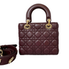 The Lucky Badges My Lady Dior Small is a feminine, stylish tote crafted of the hallmark cannage quilted lambskin leather in burgundy. The rolled reinforced leather handles provide sturdy carrying, while the embellished strap adds versatility and comfort. The bag features gold hardware and a top inner flap that opens to a classy interior in Dior monogram jacquard fabric with a zip pocket. The Charms can be interchanged with newly chosen charms sold separately at the Dior boutique.