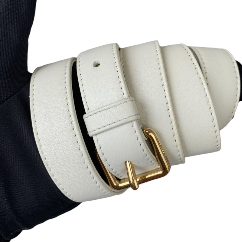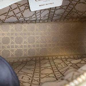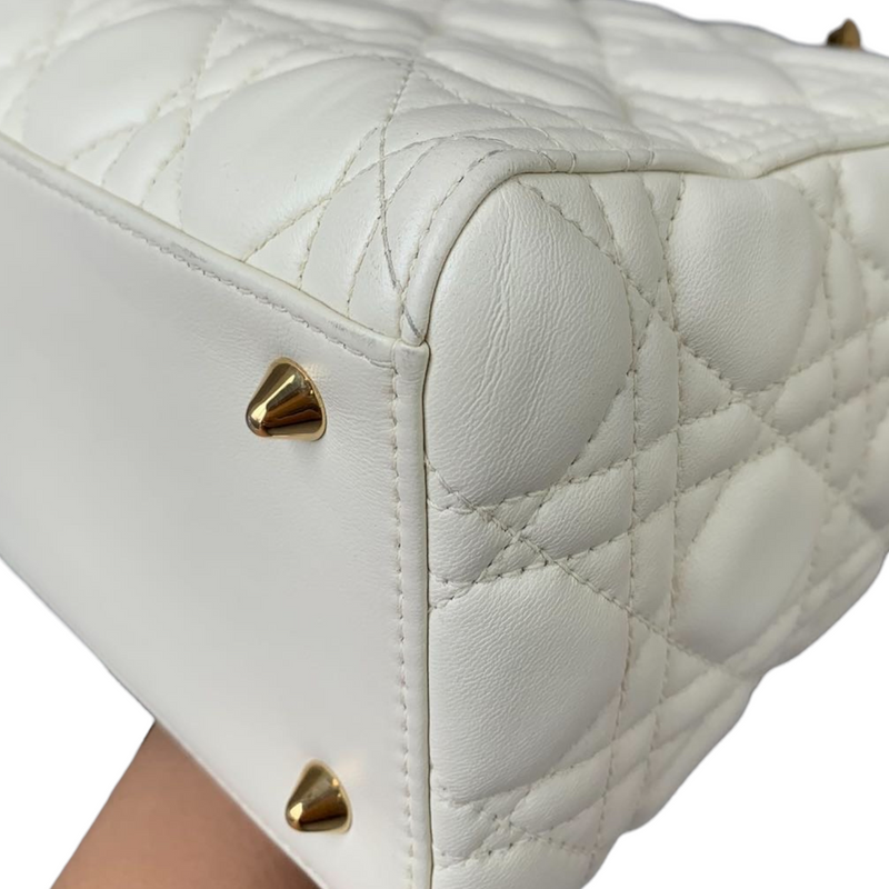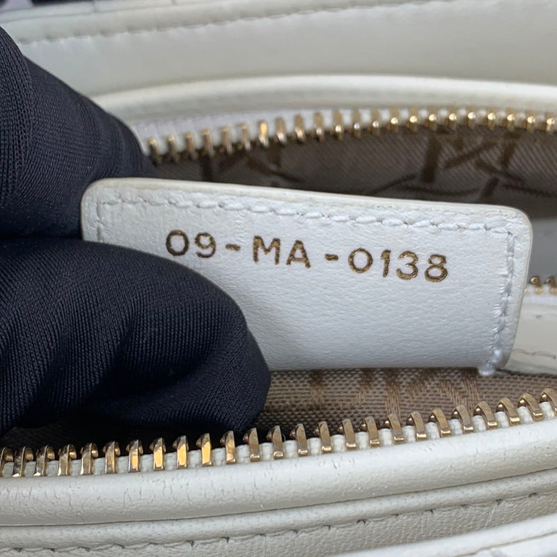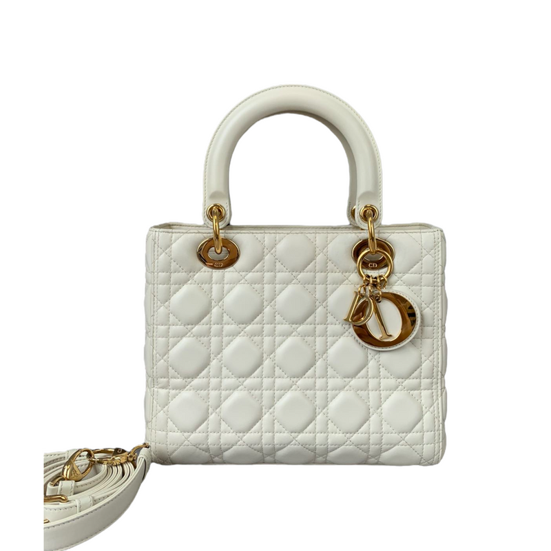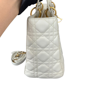 Cannage Lady Dior Medium in a rare creamy white accented with gold toned hardware. The Lady Dior features a quilted leather body, flat top handles, a detachable flat leather strap, a top zip closure, and an interior zip pocket.Authentic: DiorStyle:...