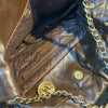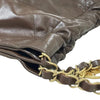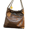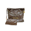 This is an authentic Chanel 22 Shiny Calfskin Quilted Large in Brown. This elegant handbag is made from diamond-stitched brown calfskin leather. It features gold chain shoulder straps interwoven with leather and a matching Chanel logo on the front. The open top, secured by a magnetic closure, reveals a brown fabric interior with a zipper pocket and a removable pouch.