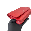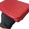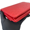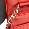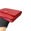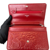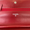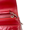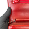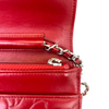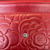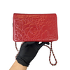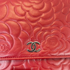 This is an authentic Chanel Lambskin Camellia Wallet on Chain WOC in Red with Silver Hardware. This stylish clutch wallet is made of camellia embossed lambskin leather. The wallet features an extra-long silver chain link shoulder strap threaded with leather and a silver faux Mademoiselle turn lock. The flap opens easily with a magnet, revealing a matching leather inside.