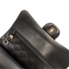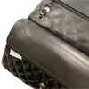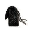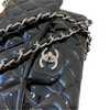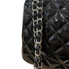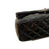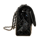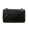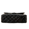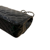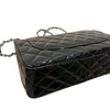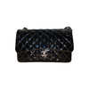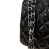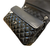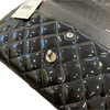 This Chanel Jumbo Classic Flap bag is made from diamond-quilted glossy patent leather. It has a structured silhouette, a silver chain leather-threaded shoulder strap, and a facing half flap with a CC turn-lock closure in silver-tone.