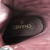 This is an authentic pair of Chanel Pearl Combat Boots Crackled Calfskin Velvet Black in Size 38. These stylish lace-up boots are made of crackled black calfskin leather. They have rounded smooth leather cap toes, a faux pearl snap closure, a quilted leather button flap, and a chain-link leather threaded base trim.