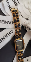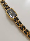 Beautiful and elegant, Chanel Première's gold plated lady's wristwatch size 16CM has a faceted glass, crown set with a black sapphire cabochon, and stored in an elegant and octagonal case. It has a black dial, quartz movement, and gold plated baton hands.