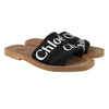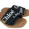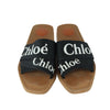 This is an authentic pair of Chloe Logo Ribbon Woody Flat Sandals Canvas Black in Size 38. They feature logo-printed crossover straps in canvas, open toes, and slight heels.