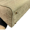 This is an authentic Christian Dior Lady Dior Medium bag in Beige with Gold Hardware. This stylish handbag is finely crafted of embroidered beige canvas with a 'Christian Dior' signature on the front and features fabric top handles and shoulder strap with gold hardware, including a Dior letters charm. The bag opens to a Dior fabric interior with hanging zipper and patch pockets.