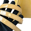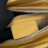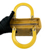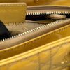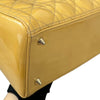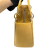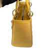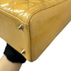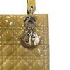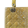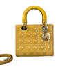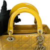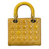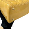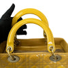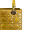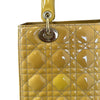 This is an authentic Christian Dior Lady Dior Medium Metallic Patent in Yellow. This elegant tote is meticulously crafted from geometric quilted patent leather. It showcases sturdy leather top handles, optional shoulder strap with polished gold hardware, including hanging Dior letter logo charms. The top zipper opens to a Dior monogram jacquard fabric interior with a zipper pocket.