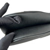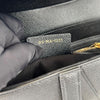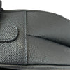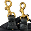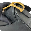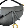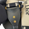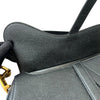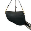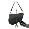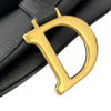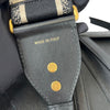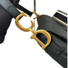 This is a genuine Christian Dior bag in black with Strap, made from medium grained leather. It has a unique saddle bag shape with a short leather shoulder strap. The strap has gold "C" and "D" logos at the ends. There's also a noticeable Dior "D" charm hanging from the bag. Inside, you'll find a black microfiber interior with a zipper pocket.
