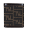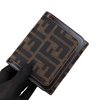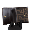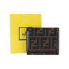 This Fendi compact wallet in a classic Zucca print is a must-have for every wardrobe. The wallet opens to a brown leather interior with a coin pocket, card slots, and a bill compartment. We love the practical size and simple, functional design.