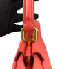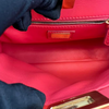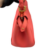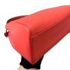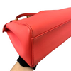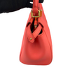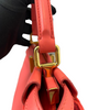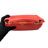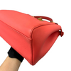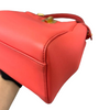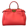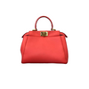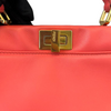This is an authentic Fendi Nappa Mini Peekaboo Iconic Satchel in Coral Red. It is made of soft nappa lambskin leather. This bag has a top handle, a shoulder strap, and elegant gold hardware with Fendi logo turn locks. When carried by the top handle with open clasps, the interior details are visible. The inside is lined with matching leather and has a patch pocket.