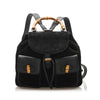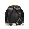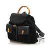 This Gucci backpack features a suede and leather body, front exterior flap pockets with a bamboo twist lock closure, flat leather back straps, a bamboo top handle, a top flap with a magnetic closure, a drawstring closure, and an interior zip pocket.