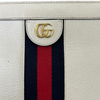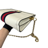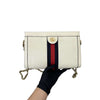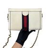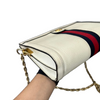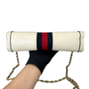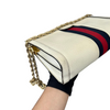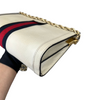 This is the authentic Gucci Ophidia Small Textured Calfskin Shoulder Bag in White with Gold Hardware. This chic bag is crafted of calfskin leather in white with a navy and red web. The bag features a gold chain shoulder strap. This opens to a nude interior with a patch pocket.