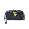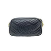 The Marmont Camera Bag bag features a quilted leather body, a gold toned chain strap, and a top zip closure.