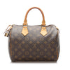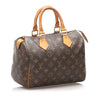 The Elegant Louis Vuitton Speedy 25 features a monogram canvas body, rolled leather handles, a top zip closure, an interior slip pocket, and engraved signature padlock.