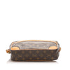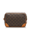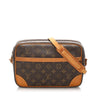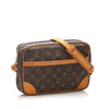 The Louis Vuitton Trocadero 27 features a monogram canvas body with a leather trim, a flat shoulder strap, a top zip closure, an exterior slip pocket, and an interior zip pocket.