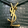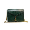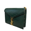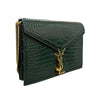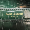 This is an authentic Saint Laurent Cassandra Shoulder Calfskin Crocodile Embossed in Green. This chic shoulder bag is made of crocodile embossed green leather. The bag features gold tone chain shoulder strap. The envelope-style crossover flap opens with a matching gold YSL monogram press lock to a black leather interior.