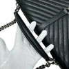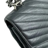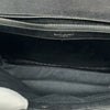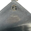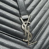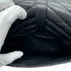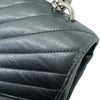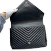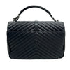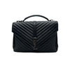 This is an authentic Saint Laurent College Satchel Large Sheepskin in Black. This chic shoulder bag is made of chevron-quilted sheepskin leather. It has a rear patch pocket, a front flap with a prominent ruthenium YSL monogram detail, and an optional ruthenium chain-link shoulder strap with a leather shoulder pad. The bag also features a leather handle and a partitioned black fabric and leather interior with a patch pocket and a central zipper compartment.