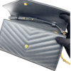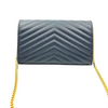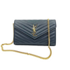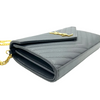This is an authentic Saint Laurent Envelope Wallet On Chain in Dark Grey. This elegant wallet on a chain is crafted of finely grained leather. The shoulder bag features a removable waist length gold chain shoulder strap and a gold classic YSL logo on the flap. This opens to a matching interior with card slots, a zipper compartment, and patch pockets.