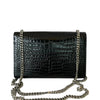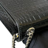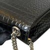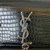 This is an authentic Saint Laurent Kate Tassel Satchel Small Calfskin Crocodile Embossed Classic Monogram in Black. This shoulder bag is made of crocodile embossed calfskin leather. It features a silver chain link shoulder strap and a facing flap with a silver YSL logo and a silver knobbed miniature chain tassel. The flap opens to a black fabric interior with a pocket.