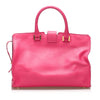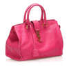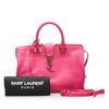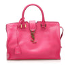 The Yves Saint Laurent Cabas Monogram satchel features a leather body, rolled leather handles, a detachable flat leather strap, a top strap with a gold-tone YSL hardware, a top zip closure, and interior zip and slip pockets.