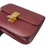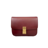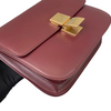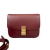 This Celine Calfskin Classic Box Bag is crafted of calfskin leather in burgundy with a structured and spacious silhouette. The bag details a waist-length shoulder strap and a facing flap with a gold-coloured press-lock.