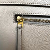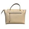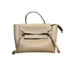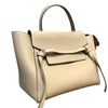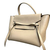 This is an authentic Celine Belt Bag Mini Grained Calfskin Light Taupe. This elegant tote, made from drummed calfskin leather, boasts a structured and roomy silhouette in light beige. It includes a leather strap top handle, an optional shoulder strap, a back zipper compartment, and a front-facing flap secured by decorative knotted straps. The flap reveals a suede interior with hanging leather patch pockets.