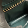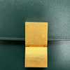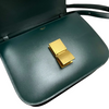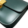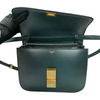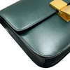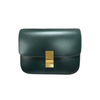 This is an authentic Celine Box Calfskin Teen Classic Box Bag in Amazone. Crafted from dark emerald green smooth box calfskin leather, this elegant shoulder bag boasts a waist-length strap and a front flap adorned with a gleaming gold switch-lock. The flap opens to a partitioned leather interior with a patch pocket.