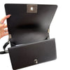 This is an authentic Chanel Boy Flap Medium Lambskin Quilted in Black. This stylish shoulder bag is made of iridescent grained lambskin leather in black framed by a linear quilting. The bag features a ruthenium chain link shoulder strap with a leather shoulder pad and a unique squared ruthenium Chanel CC press lock. The bag opens to a black fabric interior.