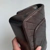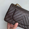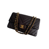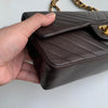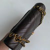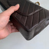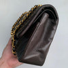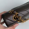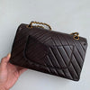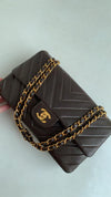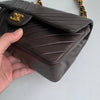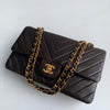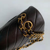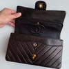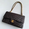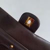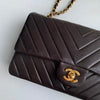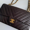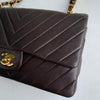 This gorgeous Chanel Vintage Double Flap Bag in Quilted Chevron Lambskin in brown leather in size medium, features a woven strap, an exterior back slip pocket and gold-tone hardware. Its double flap and frontal 24k coated gold CC turn-lock closure opens to a leather interior.
