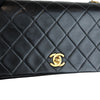 This is an authentic Chanel Vintage Single Full Flap Small Lambskin Quilted in Black. This stylish bag is crafted of smooth diamond-quilted lambskin leather in black. The bag features a gold chain leather threaded shoulder strap and a gold Chanel CC logo for the front flap. This opens to a burgundy leather interior with a pocket.