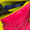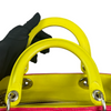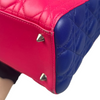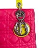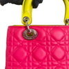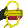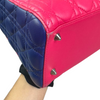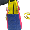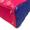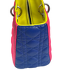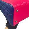 This is an authentic Christian Dior Tri-Color Lady Dior Medium Lambskin Cannage in Pink. This chic tote is made from cannage quilted lambskin leather. It boasts yellow leather handles, silver links, and blue sides. The top zipper reveals a yellow leather interior with a convenient zipper pocket.